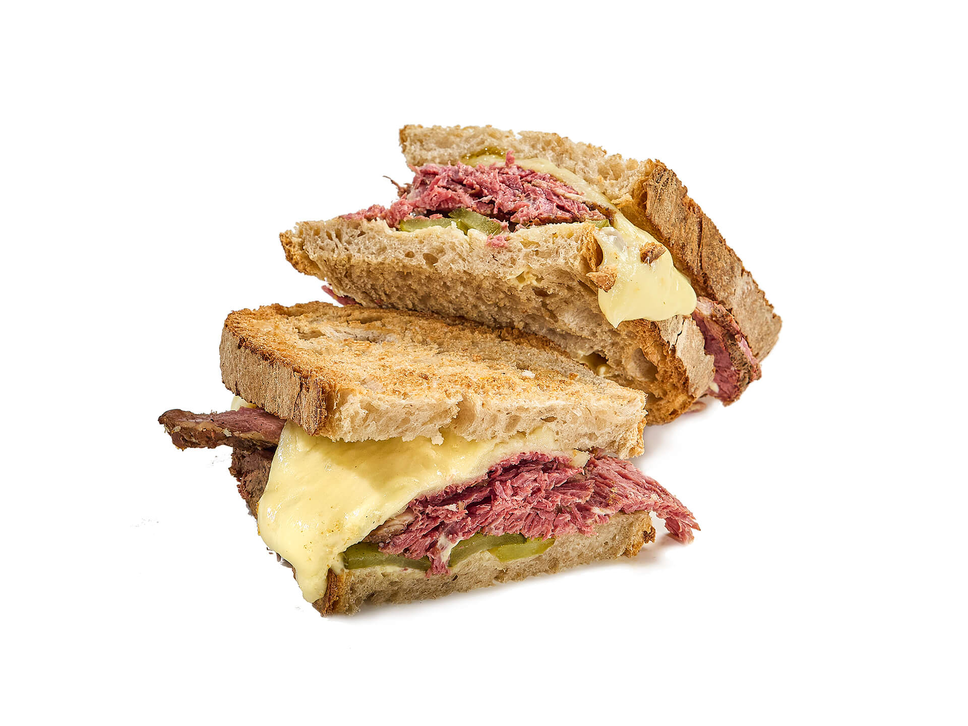 Pastrami caliente, queso Arzúa fundente, pepinillos encurtidos y salsa de mostaza intensa, en hogaza de masa madre propia. Nueva York en Gijón, sin renunciar a ingredientes de aquí.